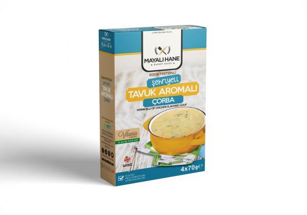 Düşük proteinli tel şehriye (%64), patates nişastası, maltodekstrin, tuz, maya özütü, toz soğan, şeker, asitlik düzenleyici (sitrik asit), doğal aroma verici (tavuk aroması), toz sarımsak, maydanoz, zerdeçal, baharatlar (karabiber, zencefil). Bir kutu Düşük Proteinli Şehriyeli Tavuk Aromalı Çorba’nın içerisinden 4 poşet toz çorba karışımı çıkmaktadır. Her bir poşetten 2 kâse çorba elde edilmektedir. Hazırlanışı için 1 paket Düşük Proteinli Şehriyeli Tavuk Aromalı Çorba’yı (70 g), 2 su bardağı (500 ml) soğuk suya ilave ediniz. Ardından kaynayana kadar karıştırınız. Kaynadıktan sonra kısık ateşte 10 dakika daha pişirip servis ediniz